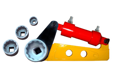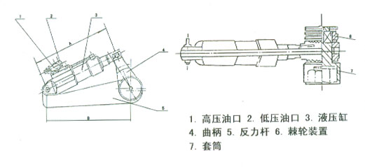 手動(dòng)高壓泵由操縱手柄,高壓泵、換向閥、油箱、壓力表和帶快速接頭的輸油管等組成。帶棘輪式液壓扳手由高壓油口、液壓油缸、曲柄、反力桿、棘輪裝置、套筒等組成、前者系動(dòng)力源部件,后者為扭矩執(zhí)行機(jī)構(gòu)。